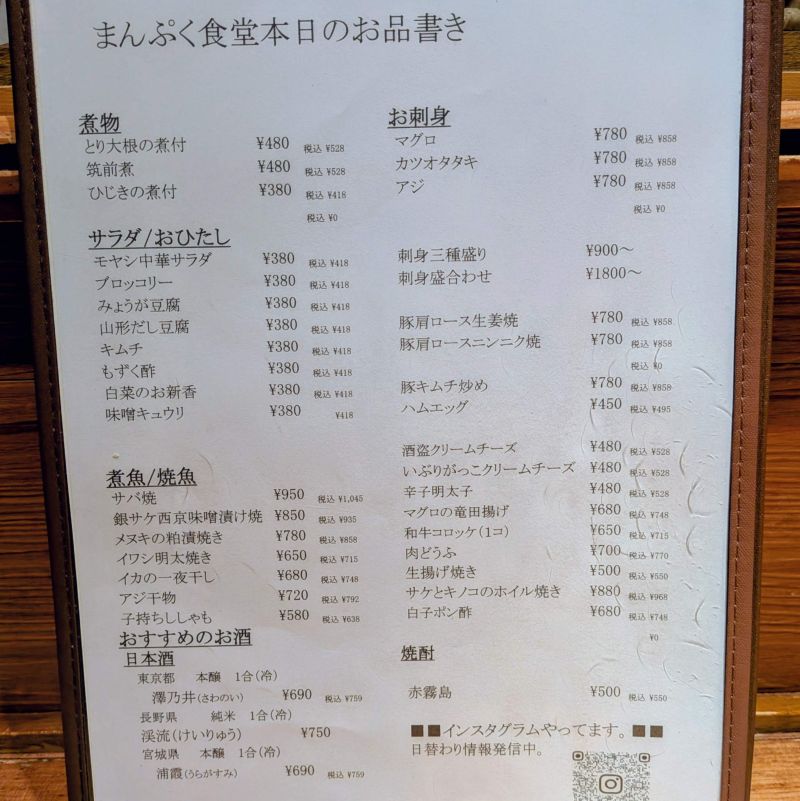 メニューを拝見すると、煮物、煮魚、焼魚、刺身なども含めたつまみ多数。