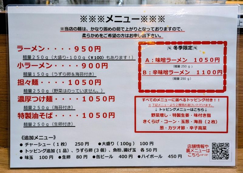 しまった、準備してなかったとメニューを拝見して、慌てて「野菜増し」「葱」をお願いしました。