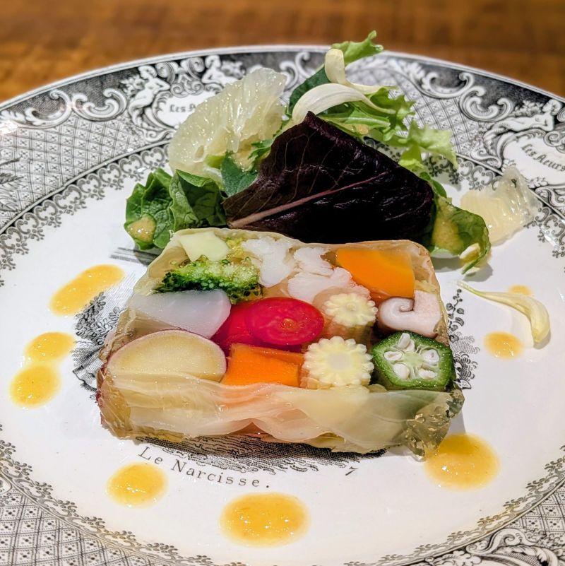 ・前菜「カラフルな野菜で彩られた美しいゼリー寄せ」