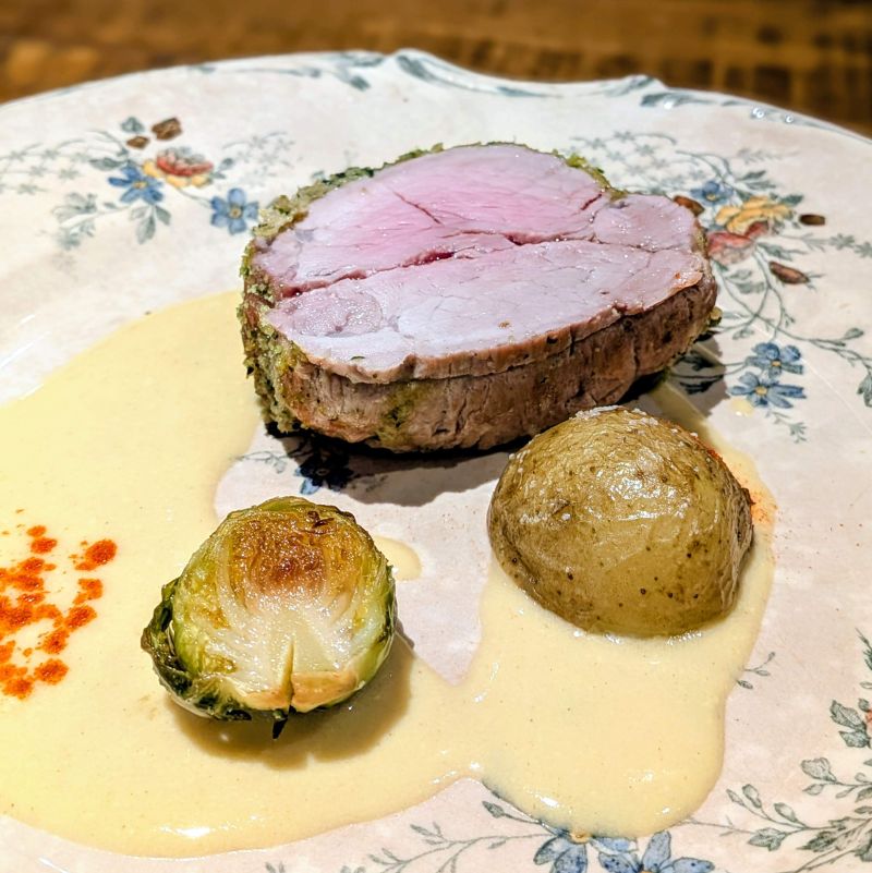メインは「豚肩ヒレ肉のディジョンマスタードソース」であり、添えられている芽キャベツやジャガイモも実に旨そう。